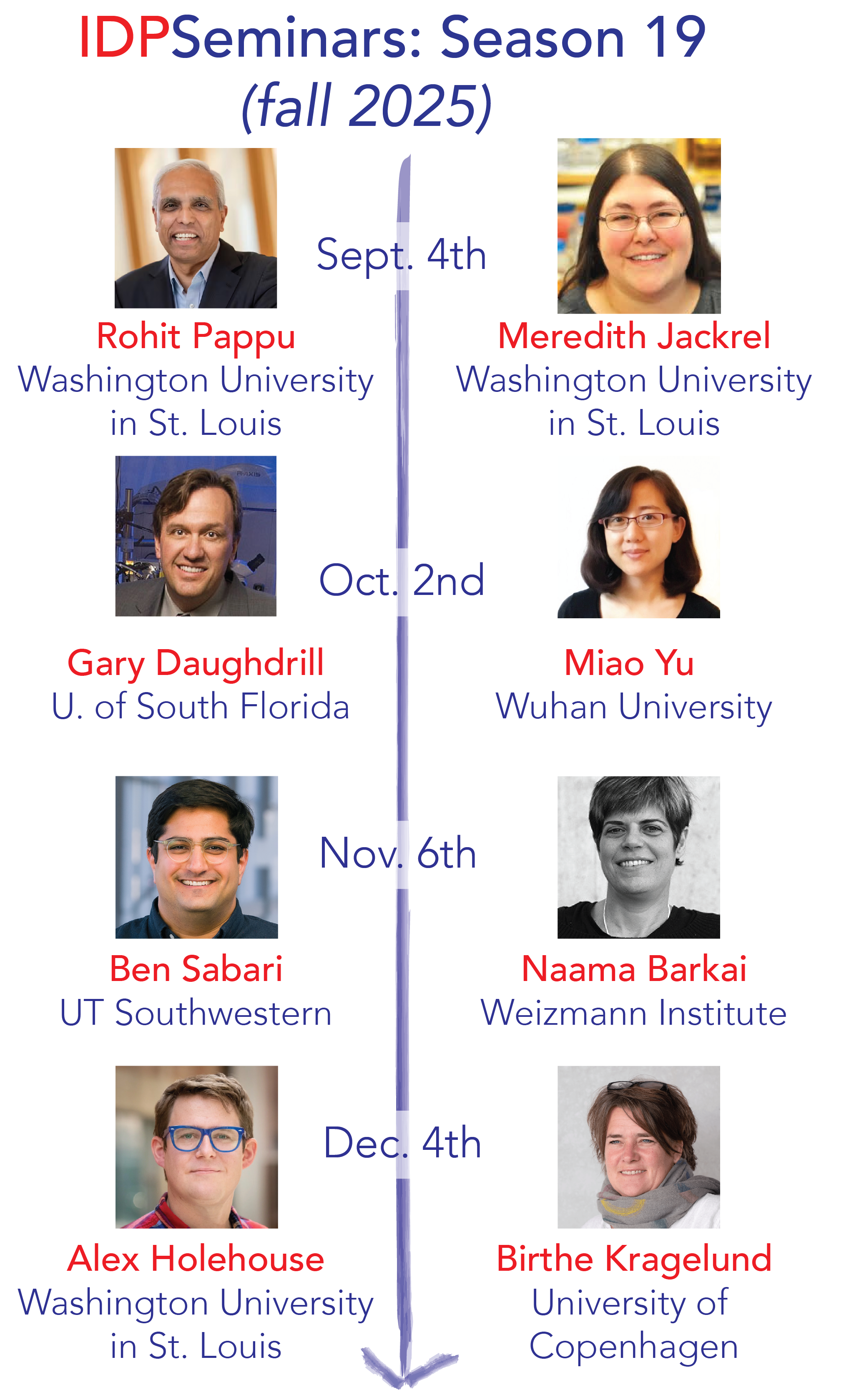 IDPSeminars is a virtual seminar series hosted by Jackie Pelham (Washington University School of Medicine) and Lucia Chemes (UNSAM). Every month, two speakers will present for around 30 minutes with 10-15 minutes of questions. The set of upcoming speakers can be found in the flyer above.