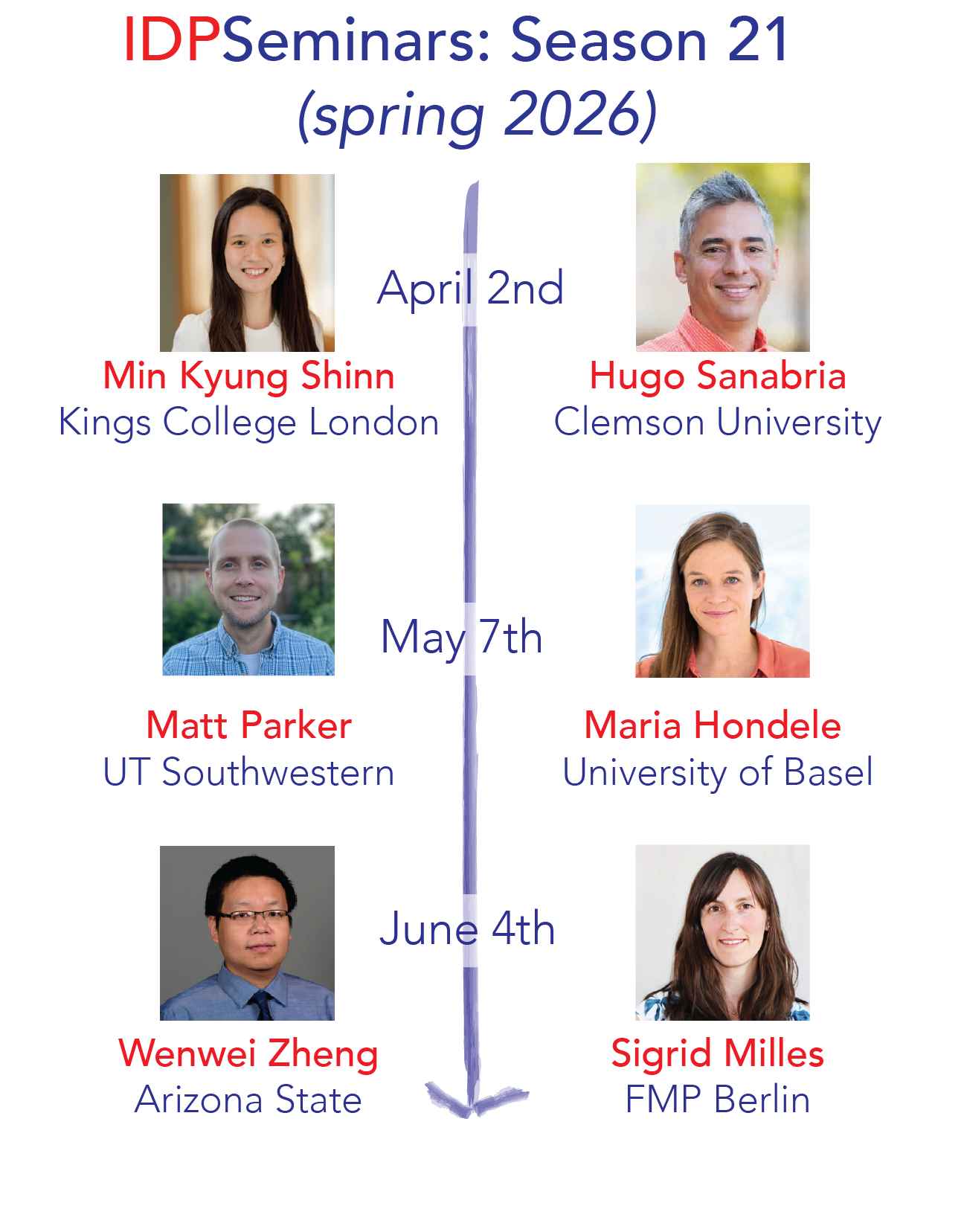 IDPSeminars is a virtual seminar series hosted by Jackie Pelham (Washington University School of Medicine) and Lucia Chemes (UNSAM). Every month, two speakers will present for around 30 minutes with 10-15 minutes of questions. The list of upcoming speakers is in the flyer above.